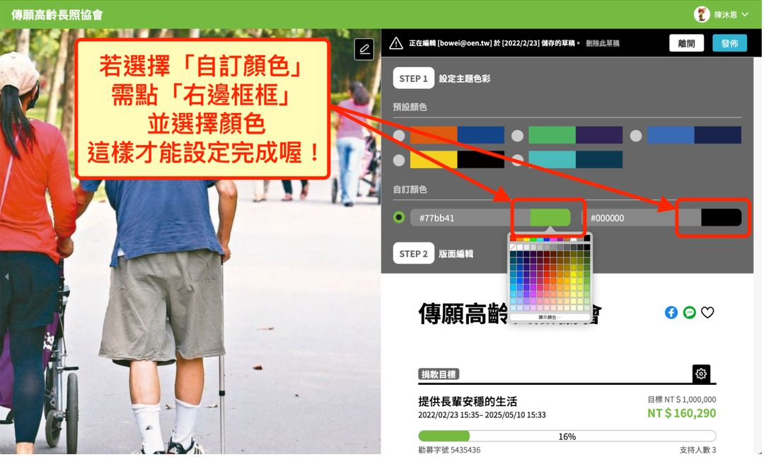 2.若選擇「自訂顏色」,請點擊「右邊色塊」並選擇顏色,即可設定完成。