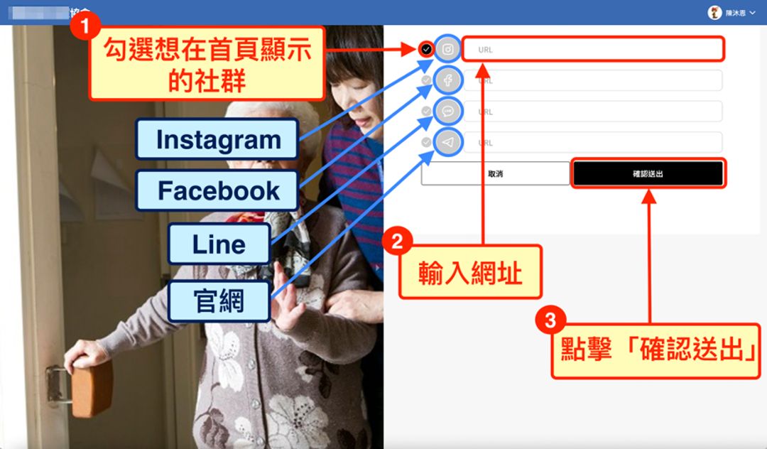 2.勾選想在首頁顯示的社群,輸入網址,確認後點擊送出即可。
