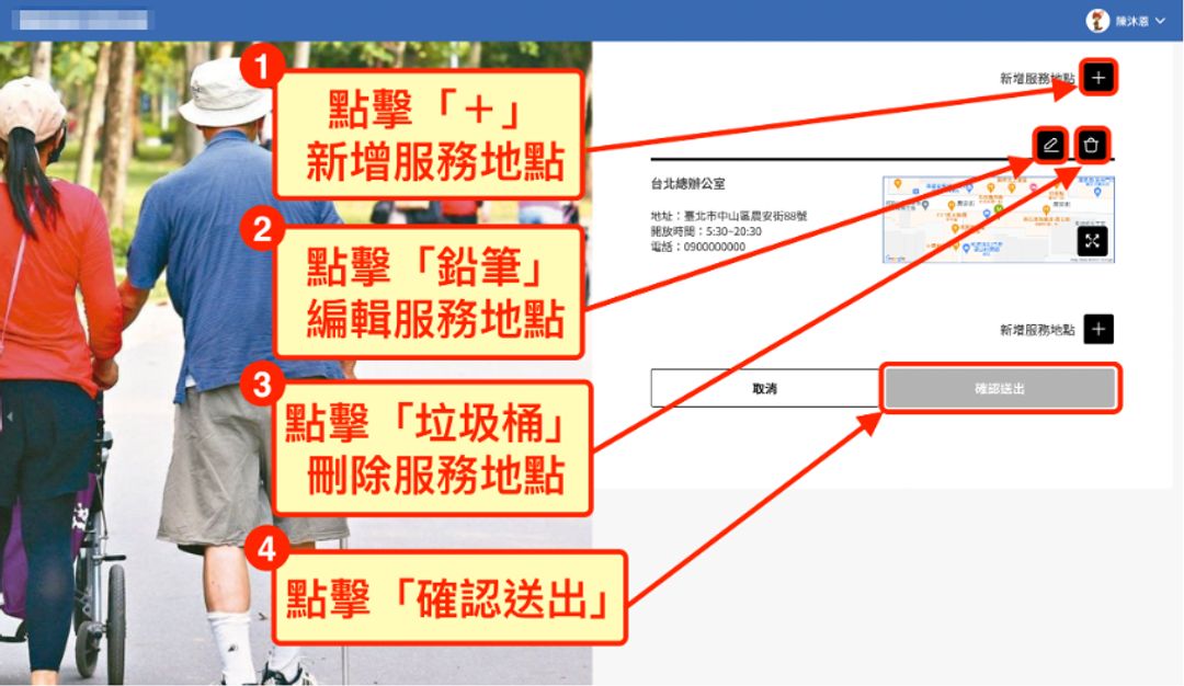 ① 點擊「+」:新增服務地點