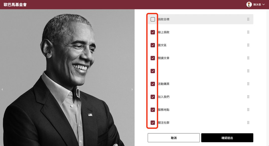 2.勾選區塊,若區塊變灰表示不顯示在前台。
