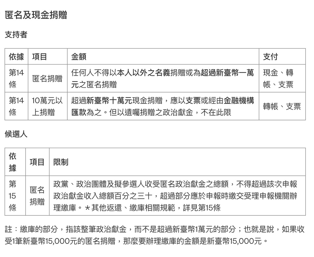 註3:107年6月20日修正政治獻金法第18條第3項規定,金錢與非金錢捐贈者,須合併計算。