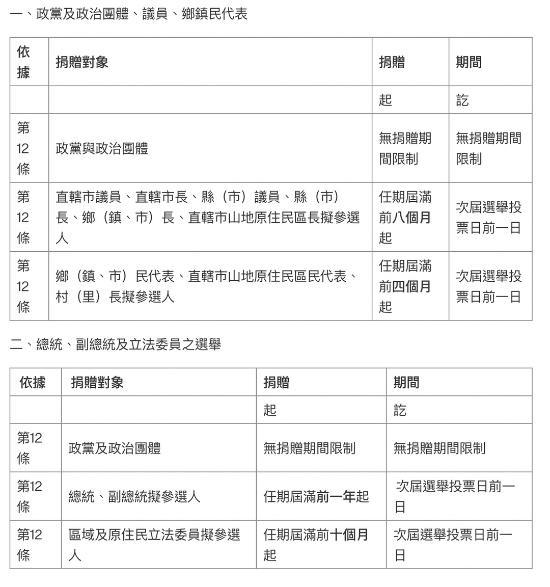 註2:公營事業、財團法人、宗教團體及公寓大廈管理委員會不能捐贈政治獻金,惟醫療社團法人、信用合作社、農漁會信用部可以捐贈政治獻金。
