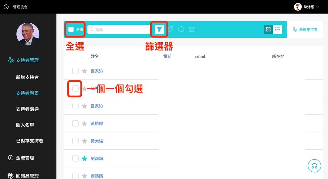 (2) 勾選欲傳送簡訊的支持者,篩選方法:全選、篩選器、一個一個勾選。