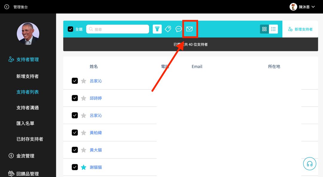 (1) 點擊支持者管理 > 支持者列表。