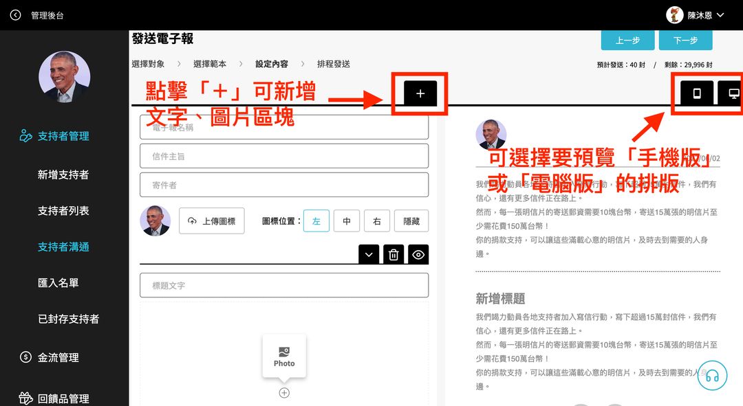 (5) 依欄位填入文字,點擊「+」可新 增區塊,右方可以預覽編排內容,確認後點擊下一步。