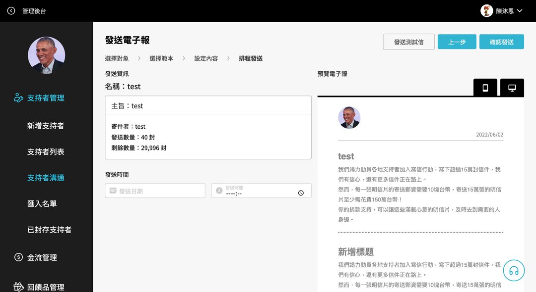 (6) 選擇發送時間及日期,可先發送測試信檢查文字、排版,確認無誤後點擊「確認發送」,即可在指定時間發送電子報。