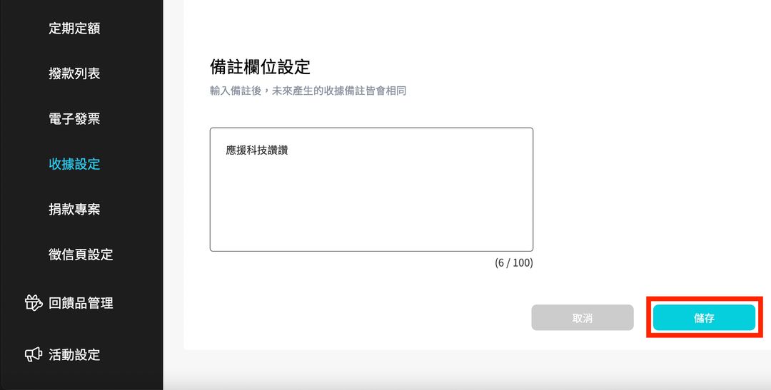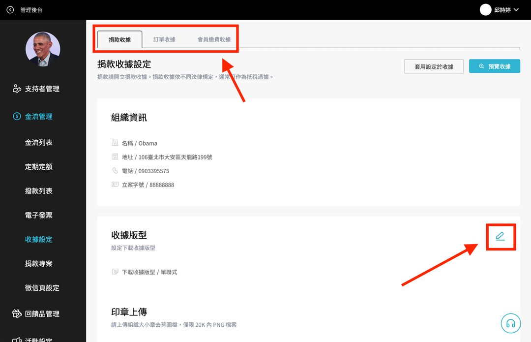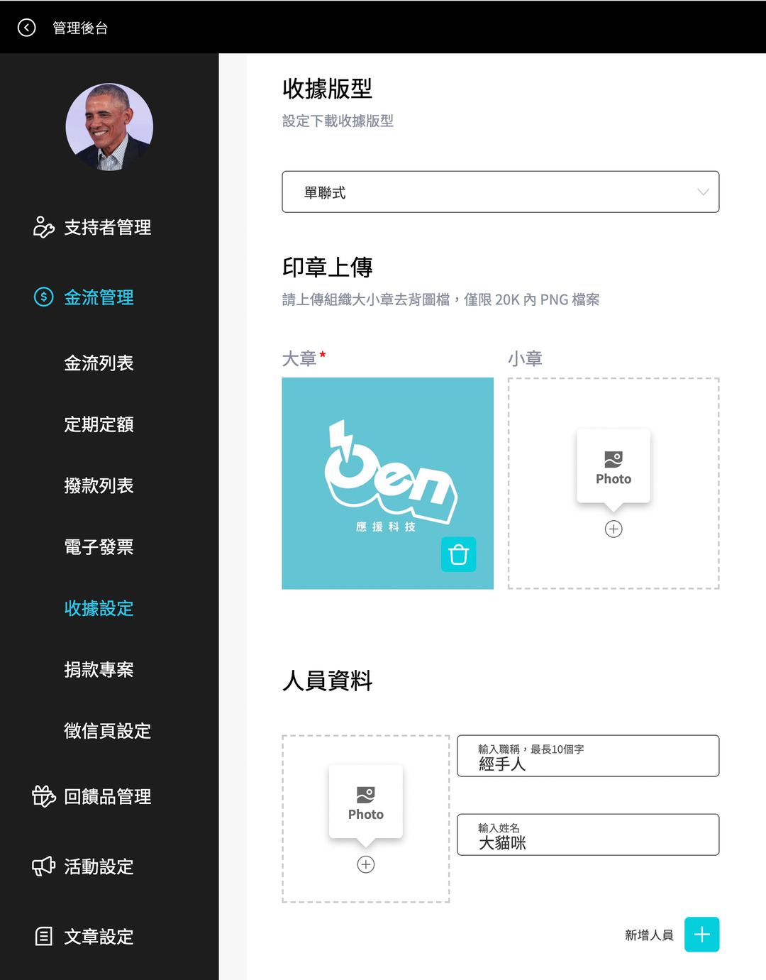 (3) 依照欄位編輯收據內容,可以選擇「收據版型」、「上傳大小章」、「上傳經手人印章及資料」,備註欄可以寫上寫對支持者說的話,完成後點擊「儲存」。