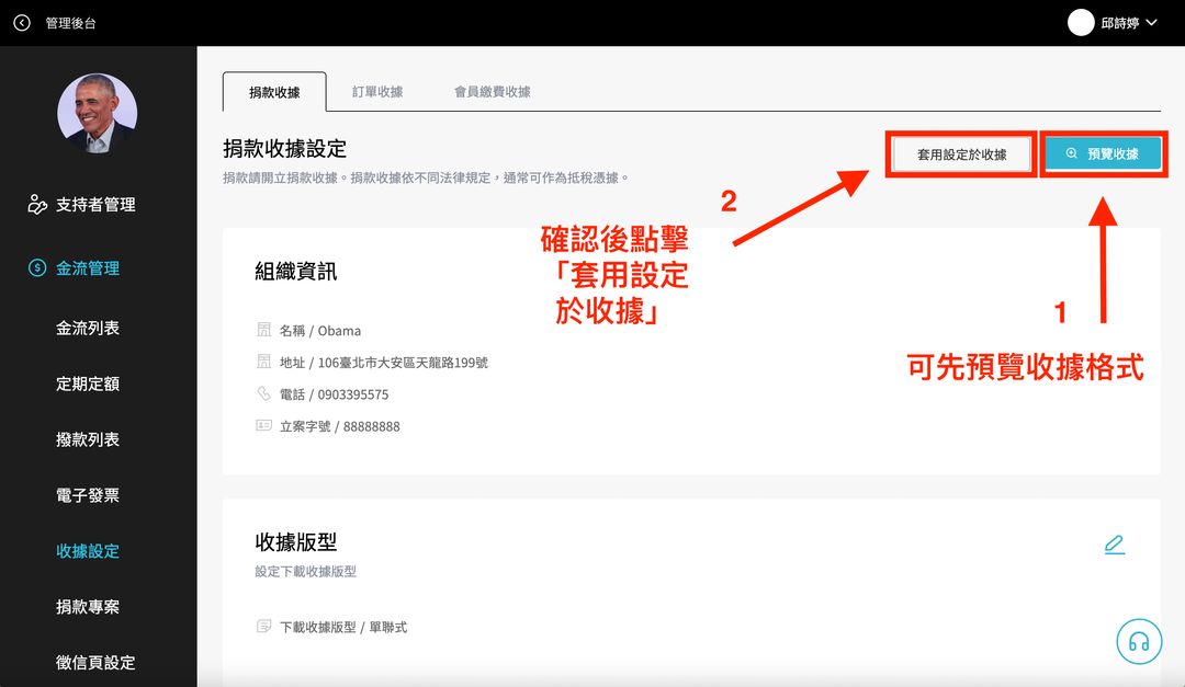 (4) 回到前頁後,可先點擊「預覽收據」檢查收據是否有誤,確認後點擊「套用設定於收據」即可更新所有收據。