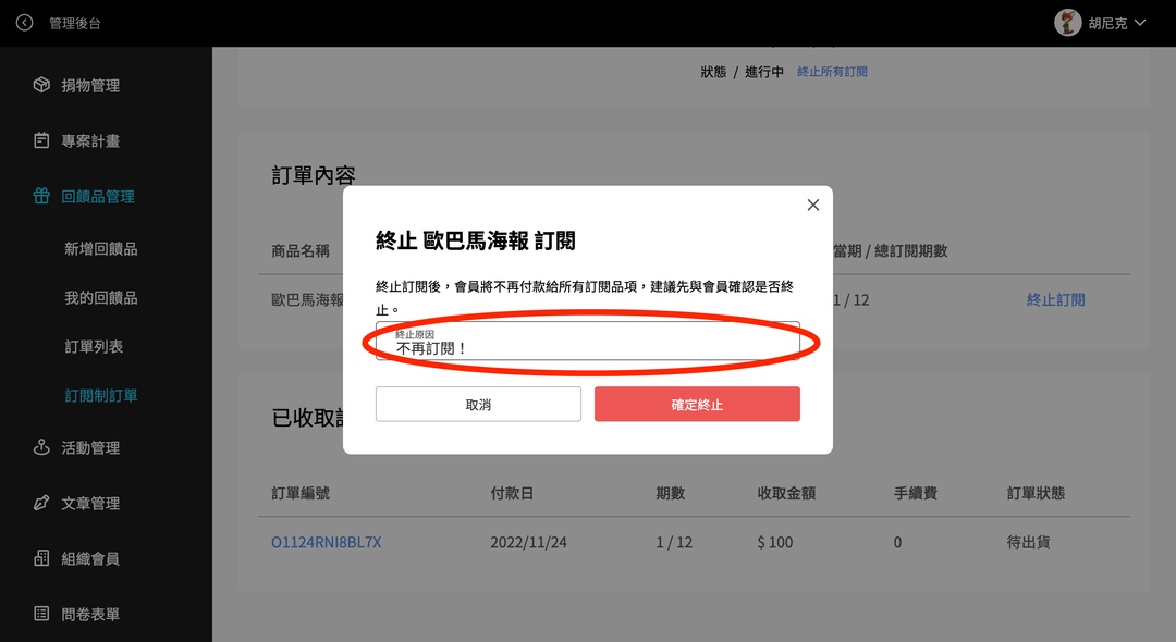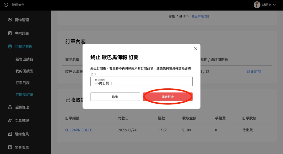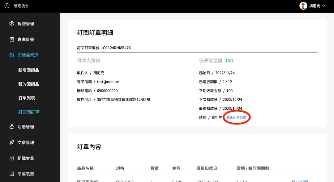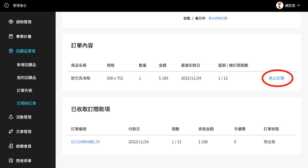 *註:一筆訂閱制訂單可能有多筆商品,例如:A, B, C。「終止訂閱」是可以取消同筆訂單部分商品的訂閱,例如只終止B商品;「終止所有訂閱」會把整筆訂單的 A, B, C商品全部終止。