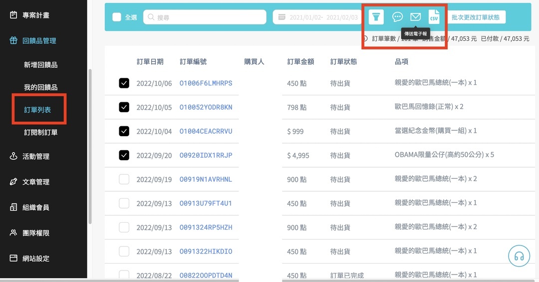 或者,是針對貨物寄送狀況有話要說時,都可以直接從訂單列表中,發送電子報給支持者!