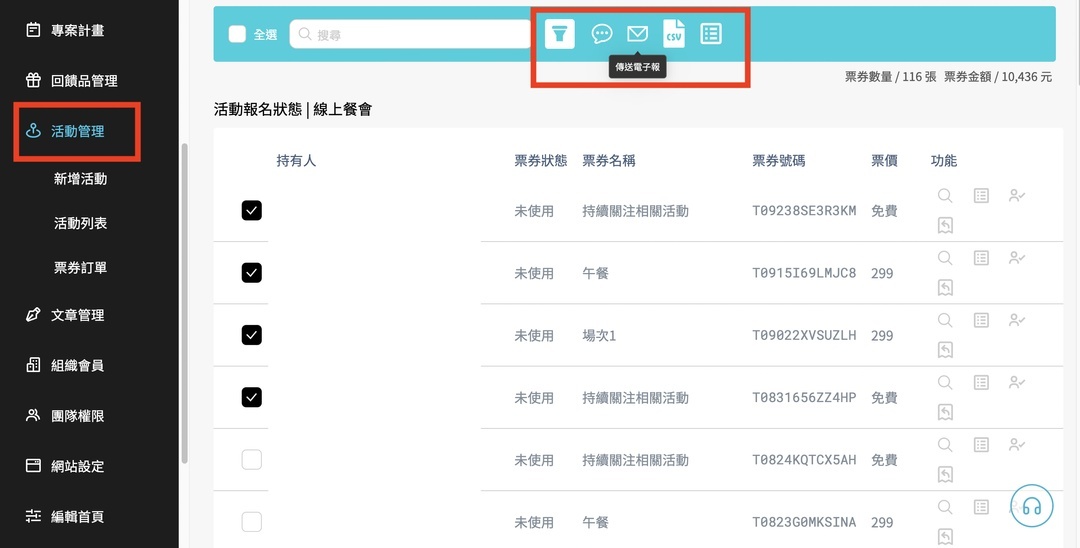 還有還有,當你有些話想對來參加特定活動的支持者分享時,也可以直接從活動列表裡,選擇好你想要溝通的活動、對象等等來發送電子報,感謝他們來參加活動,或是提醒他們行前注意事項等都很好用喔!