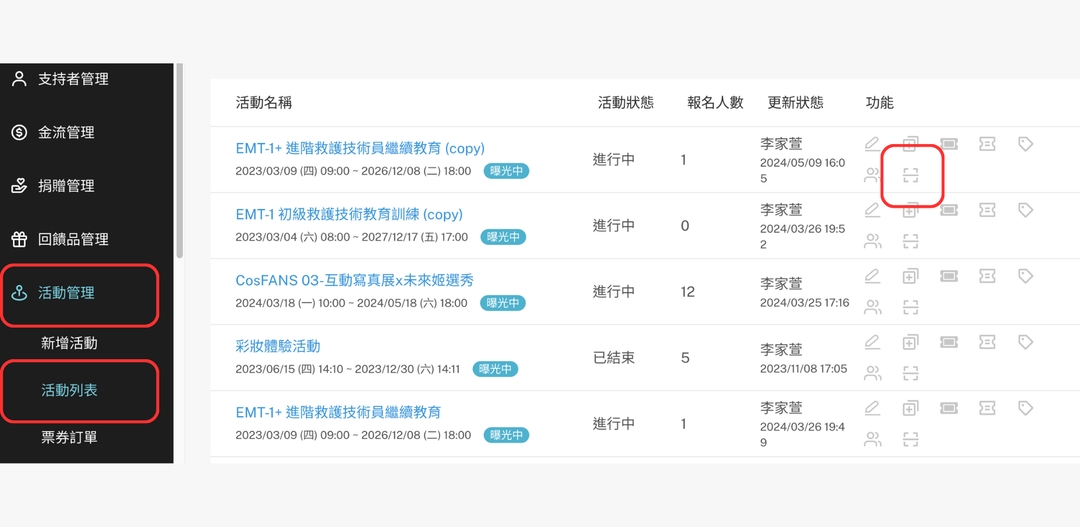 2. 點擊「活動管理」,點擊「活動列表」,點擊需驗票之活動的「活動驗票」按鈕。