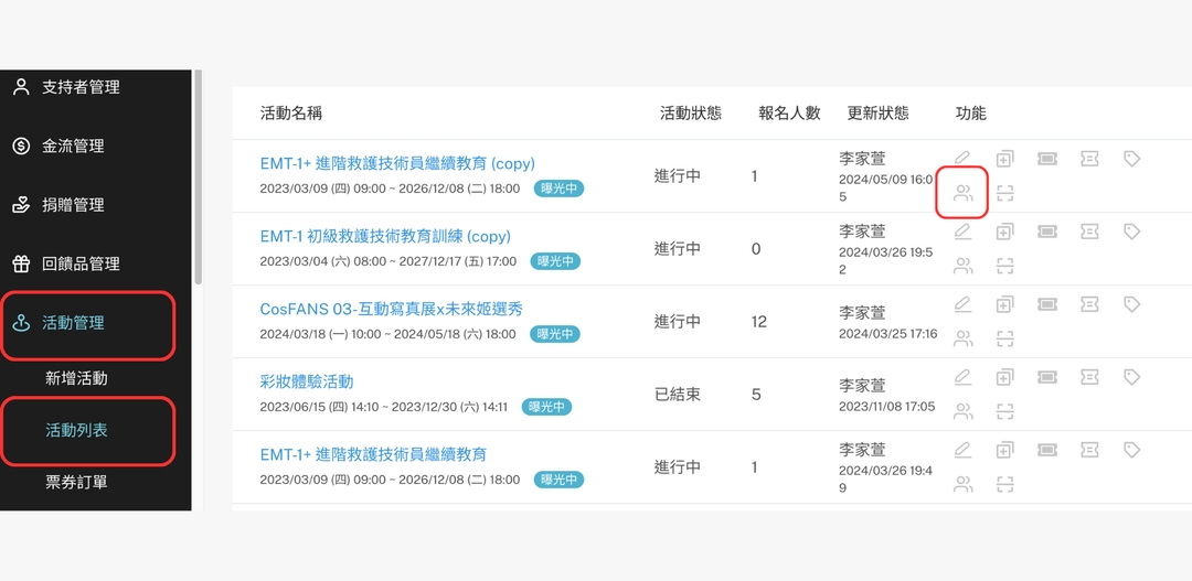 2. 點擊「活動管理」,點擊「活動列表」,點擊需驗票之活動的「查看報名者」按鈕。