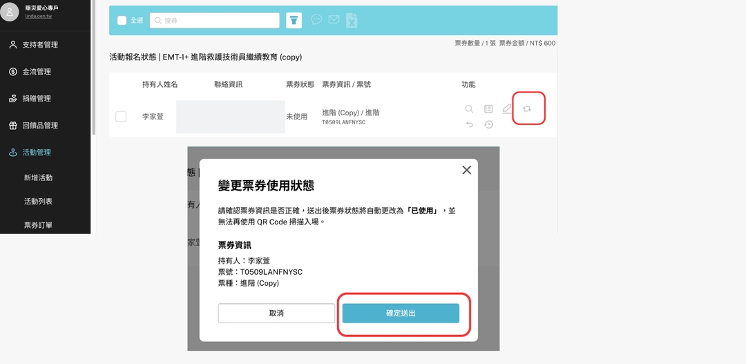 3. 搜尋姓名或電話,點擊「變更票券使用狀態」。