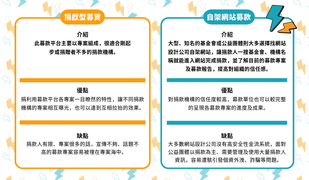 台灣常見公益募款平台有兩種,分為「捐獻型募資」及「自架網站募 款」。