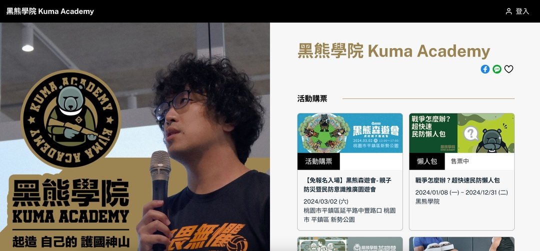 以「黑熊學院」推廣民防教育為例,既有定期舉辦的「基礎營」,也有廣邀大眾參與的「聚會、講座」等類型,因此在設定活動票券時,必須同時設定多種活動頁面,才能滿足多個活動同時進行的需求。
