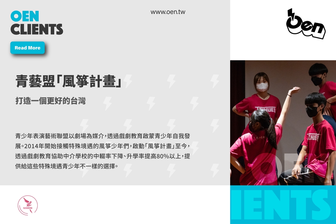 創辦人余浩瑋於2000年踏入劇場領域,2006年創立「青藝盟(青少年表演藝術聯盟)」,接手辦理「花樣戲劇節」至今已屆24年,花樣最重要的意義不只是孕育人才而是陪著青少年找到自己,並理解自己、別人與社會之間的角色關係,繼而能夠擁有信念也去給自己承諾。2014年開始接觸特殊境遇的風箏少年們,啟動「風箏計畫」至今,已透過戲劇教育協助中介學校的中輟率下降、升學率提高80%以上,藝術能讓這些特殊境遇青少年看見不一樣的選擇,若能因此帶回一個可能走偏的青少年,也省下了可能發生的社會成本。2022年啟動「牽風箏的人-全國中介學校戲劇教育輔導支持陪伴計畫」,希望分享專業並培育出更多牽風箏的人,陪伴每個需要被承接的青春靈魂。
