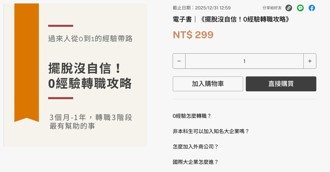 萊恩日誌 決定要販售的商品是電子書:《擺脫沒自信!0經驗轉職攻略》,銷售頁面如下: