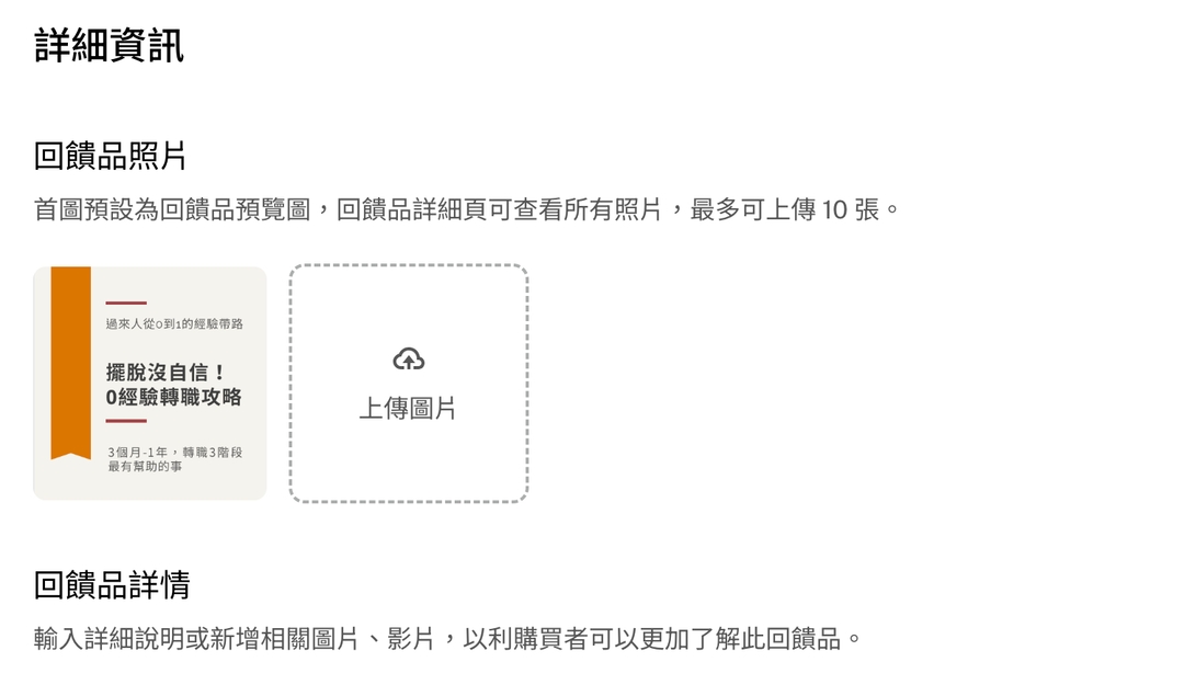 填寫「詳細資訊」時,要有耐心。因為「回饋品照片」不能批次上傳圖片,只能單張上傳,提醒創作者務必精挑細選。