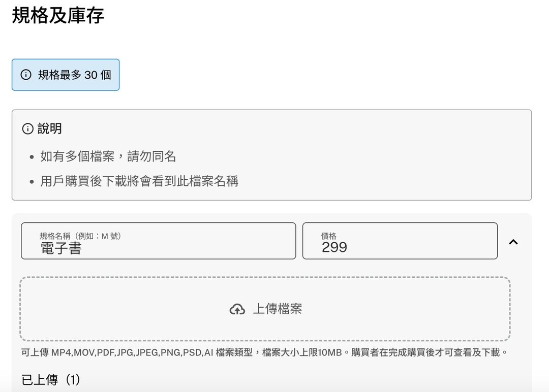 最後,填寫你的數位商品價格和規格。由於數位商品沒有實體存量限制,因此庫存量可以選擇「無限」。