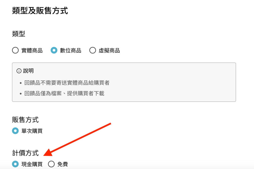 如果是付費的數位商品,創作者務必勾選此項,也無需擔心消費者只能用「現金」付款,收不收得到錢的問題。