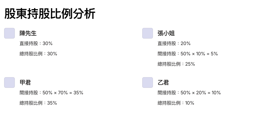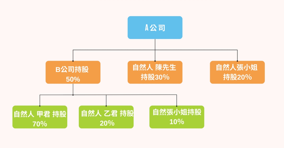 「間接持股」指經由法人股東等方式層層持股所形成之控制權。
